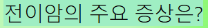 전이암은 전이된 부위에 따라 달라집니다. 예를 들어 폐로 전이된 경우에는 기침, 호흡곤란, 흉통 등이 나타날 수 있고, 뼈로 전이된 경우에는 극심한 통증이나 병적 골절이 생기기도 합니다. 간 전이의 경우 피로감, 황달, 복부 팽만 등이 나타납니다.